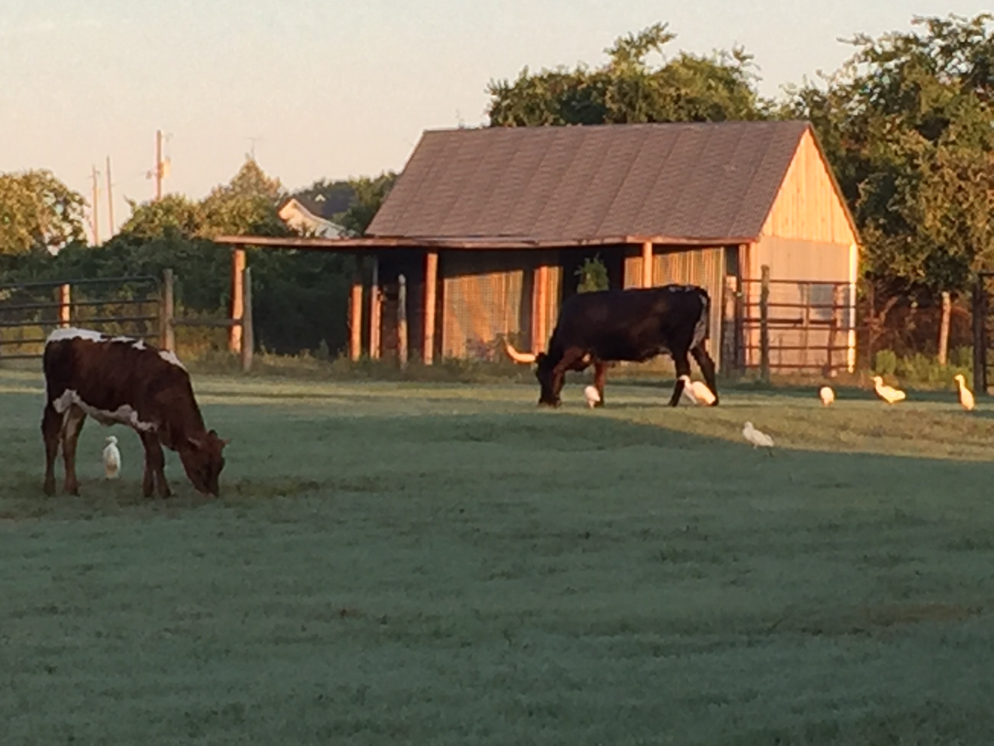 The egrets are enjoying an early morning breakfast with Diamond and her calf.