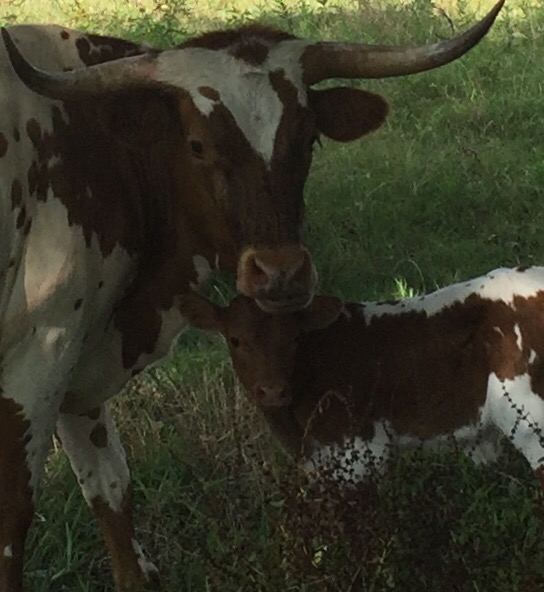 Meet Spot’s first calf! He’s doing fine and momma has taken on her duties as a good longhorn mom! Spot is so named because she really thinks she is a dog and loves to hang out around the house with her pals Fred (a dog) and Max (a wonder dog!)!!!
